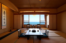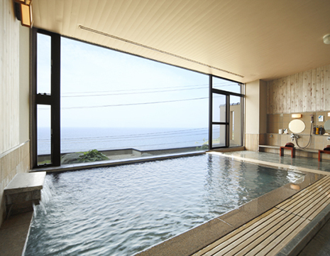 PH10.5の高泉質アルカリ性の温泉に浸かりながら、眼前に雄大な日本海を眺める