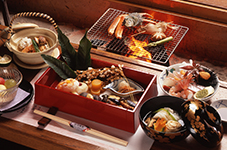 囲炉裏でじっくりと焼かれた魚介類の芳しい香りに旅の風情も最高潮