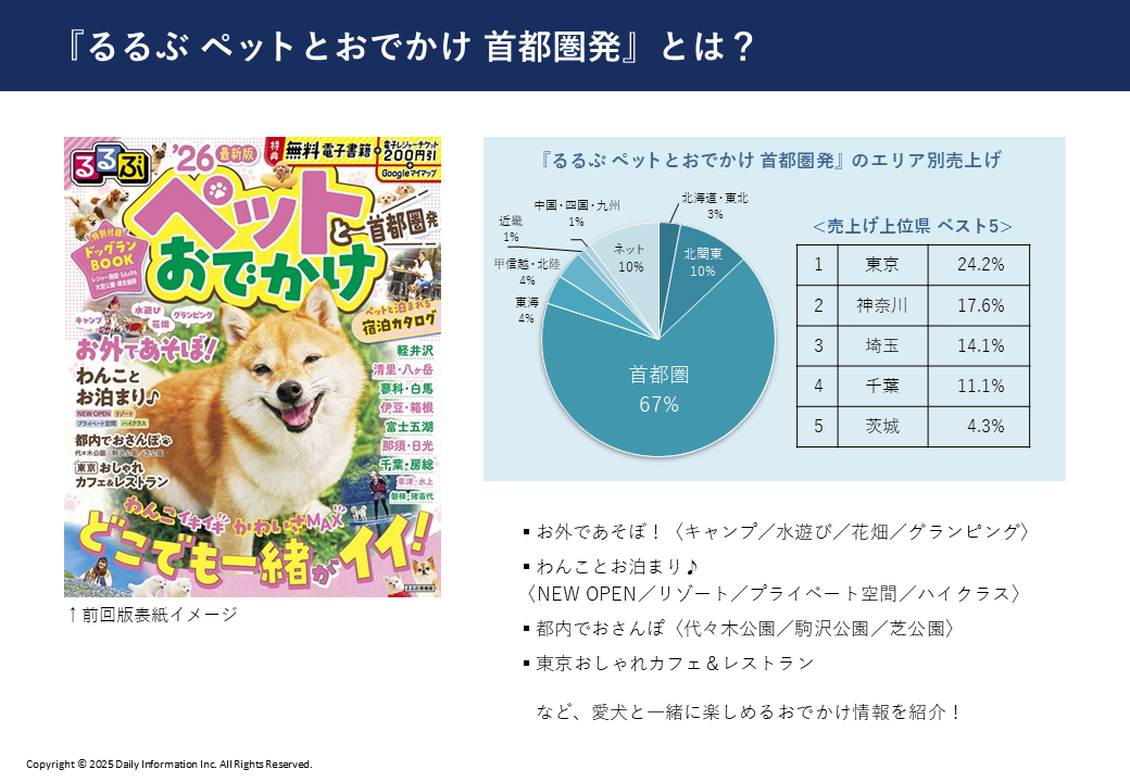 各地のペットフレンドリーな観光スポットや宿泊施設、飲食店など、愛犬とのおでかけを楽しむための情報が詰まっています。