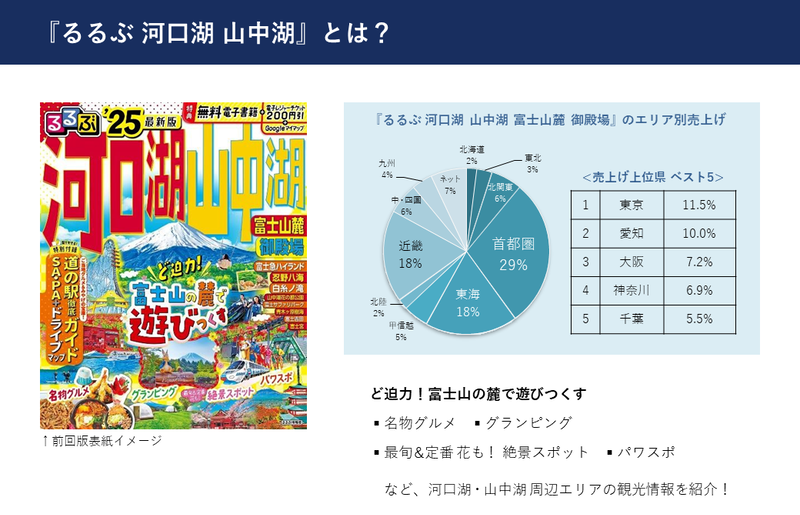 『るるぶ 河口湖 山中湖』の主な特集内容や、地域別売り上げデータを紹介しています。