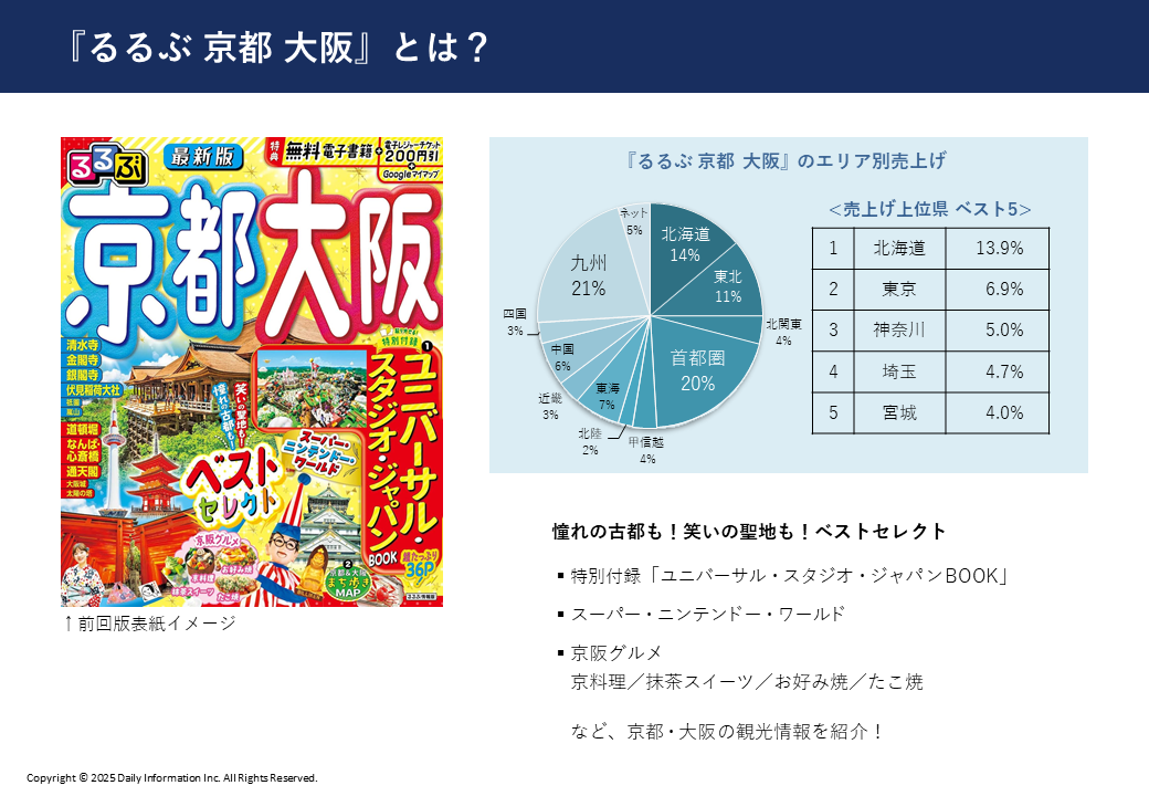 ユニバーサル・スタジオ・ジャパンの最新情報をはじめ、外せない定番観光スポットや必ず食べたいグルメなど、京都と大阪の魅力をぎゅっと詰め込んだ一冊です。広告出稿を考えている企業や施設にとって、理想的なプロモーションツールとなるでしょう。