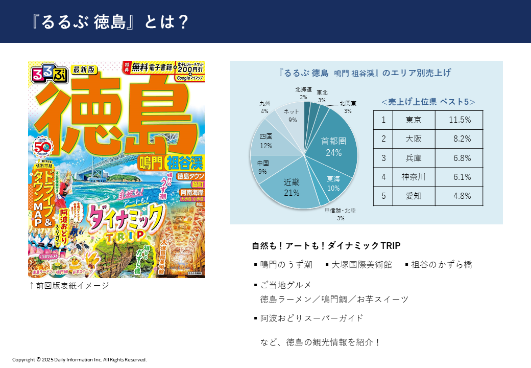 鳴門のうず潮や大塚国際美術館、祖谷かずら橋などの代表的観光地をはじめ、阿波おどりや地元グルメなど、徳島ならではの体験を網羅的に紹介。観光の計画段階から現地滞在まで、読者に寄り添う情報を提供することで、高い閲読率と広告接触率を誇る媒体です。