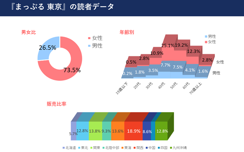 読者データによると女性が約7割を占め、特に40~50代から厚い支持を得ています。また関西や東海など遠方からの購入比率が高く、地方からの旅行者に重宝されています。
