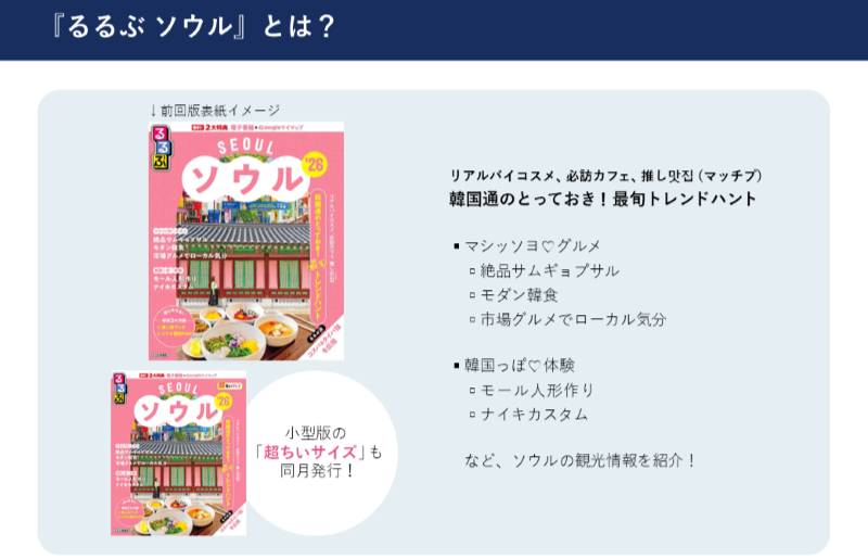 JTBパブリッシングが発行するガイドブック『るるぶソウル』は、ソウルの最新トレンドを網羅しており、旅行者にとって欠かせない情報源となっています。