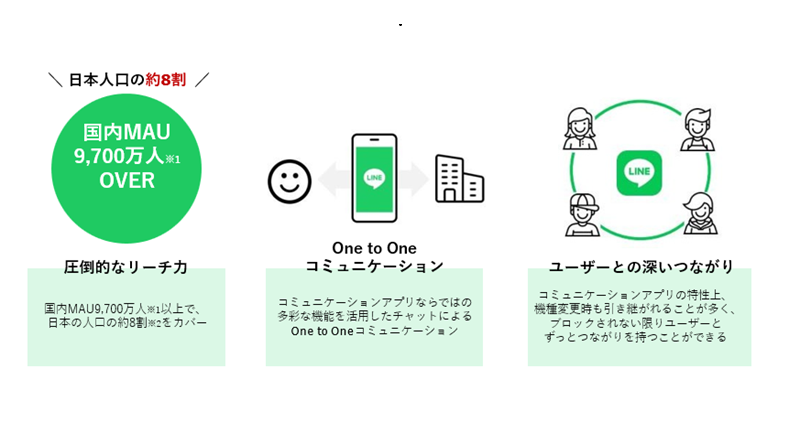 今や、国内月間アクティブユーザー9,700万人以上 、日本の人口の約8割が利用する コミュニケーションアプリ「LINE」 。