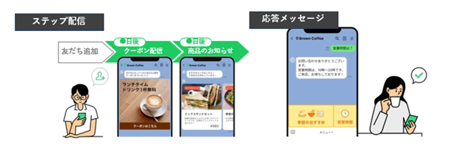 ステップ配信: 「友だち追加から〇日後にクーポンを送る」「特定の商品をクリックした人に〇日後に関連情報を送る」など、設定したシナリオでメッセージを自動配信する機能です 。