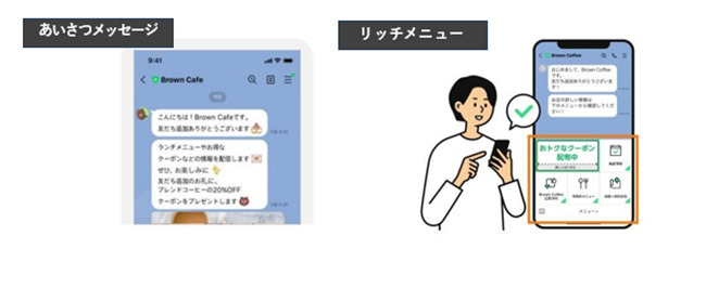 リッチメニュー: トーク画面下部に固定表示されるメニュー 。Webサイトへの誘導、予約ボタン、クーポン一覧など、ユーザーを次の行動に導く「アプリの入り口」のような役割を果たします 。
