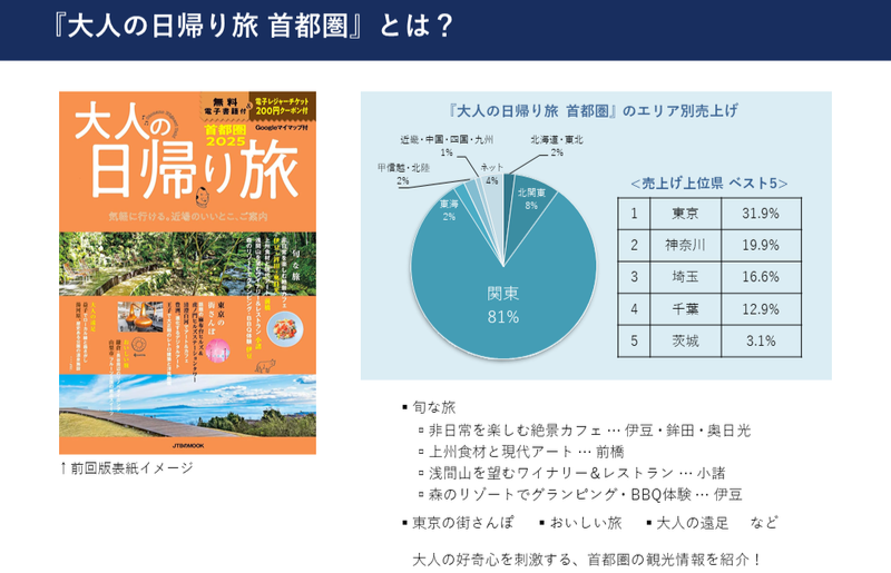 『大人の日帰り旅 首都圏』の主な特集内容や、地域別売り上げデータを紹介しています。