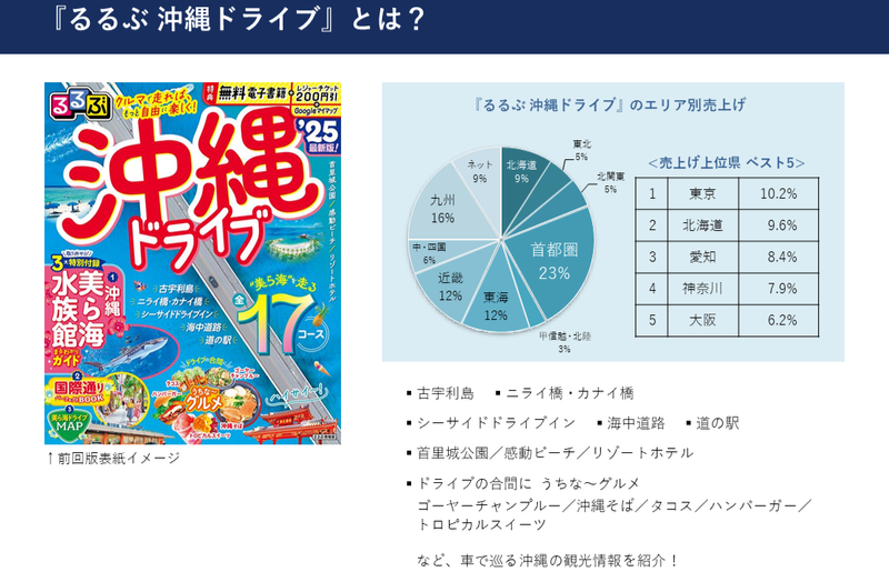 『るるぶ 沖縄ドライブ』の主な特集内容や、地域別売り上げデータを紹介しています。