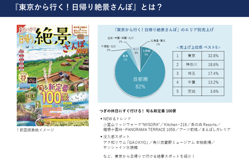 『東京から行く!日帰り絶景さんぽ』の主な特集内容や、地域別売り上げデータを紹介しています。