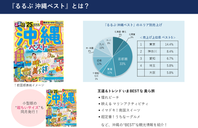『るるぶ 沖縄ベスト』の主な特集内容や、地域別売り上げデータを紹介しています。