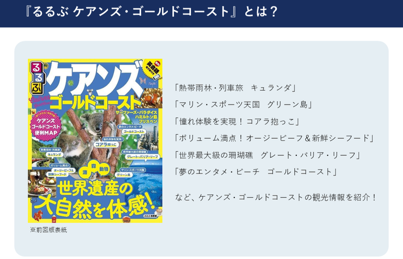 『るるぶ ケアンズ ゴールドコースト』の主な特集内容を紹介しています。
