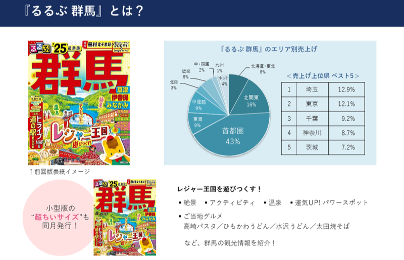 『るるぶ 群馬』の主な特集内容や、地域別売り上げデータを紹介しています。