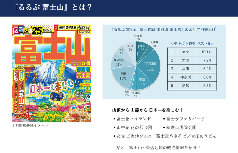 『るるぶ 富士山』の主な特集内容や、地域別売り上げデータを紹介しています。
