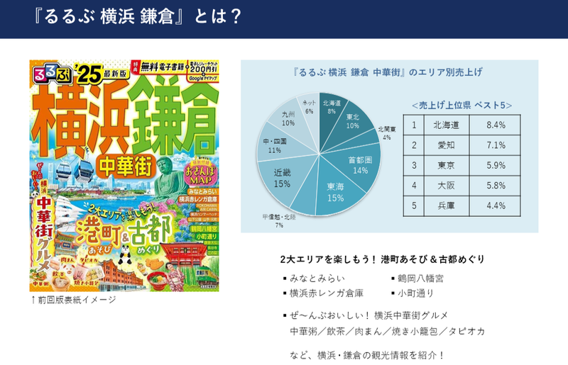『るるぶ横浜 鎌倉 中華街』の主な特集内容や、地域別売り上げデータを紹介しています。