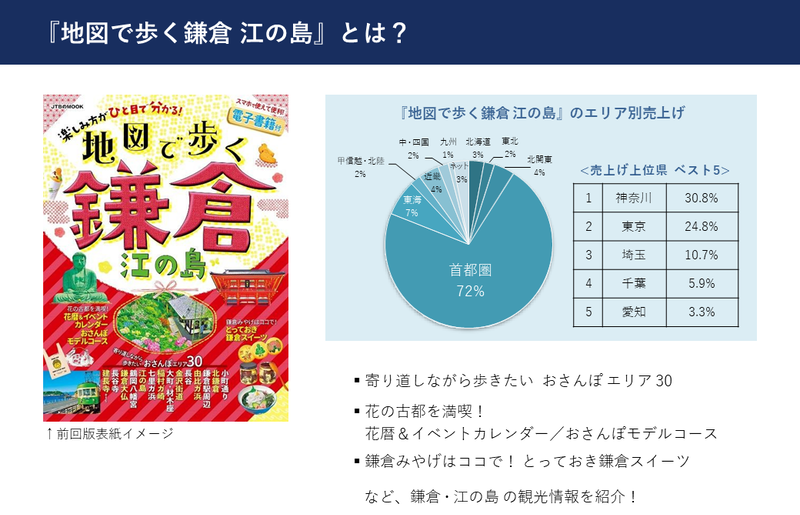 『地図で歩く鎌倉 江の島』の主な特集内容や、地域別売り上げデータを紹介しています。