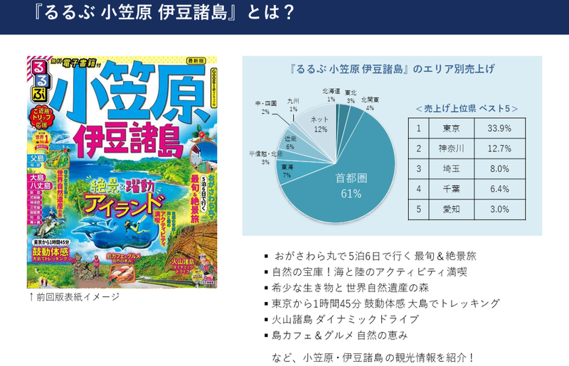 『るるぶ小笠原 伊豆諸島』の主な特集内容や、地域別売り上げデータを紹介しています。