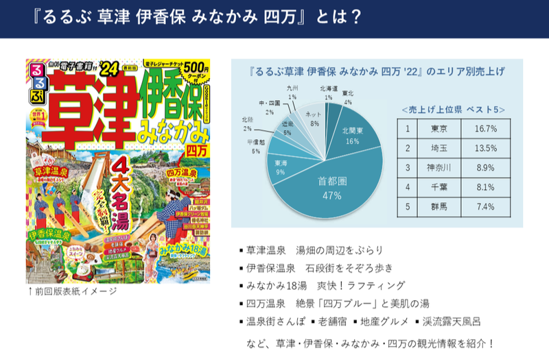 『るるぶ草津 伊香保 みなかみ 四万』の主な特集内容や、地域別売り上げデータを紹介しています。