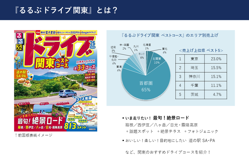 『るるぶドライブ関東ベストコース』の主な特集内容や、地域別売り上げデータを紹介しています。