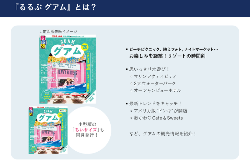 『るるぶ グアム』の主な特集内容を紹介しています。
