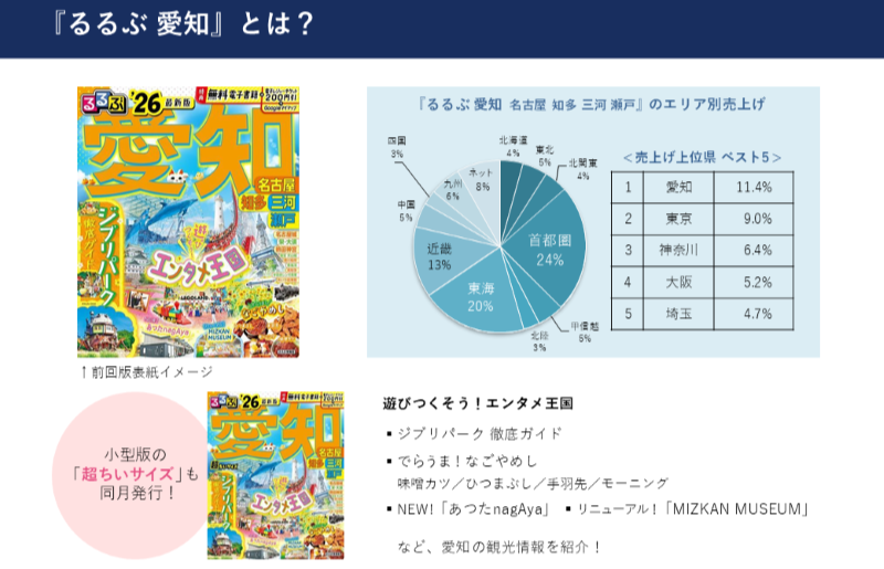 『るるぶ愛知 名古屋 知多 三河 瀬戸』の主な特集内容や、地域別売り上げデータを紹介しています。