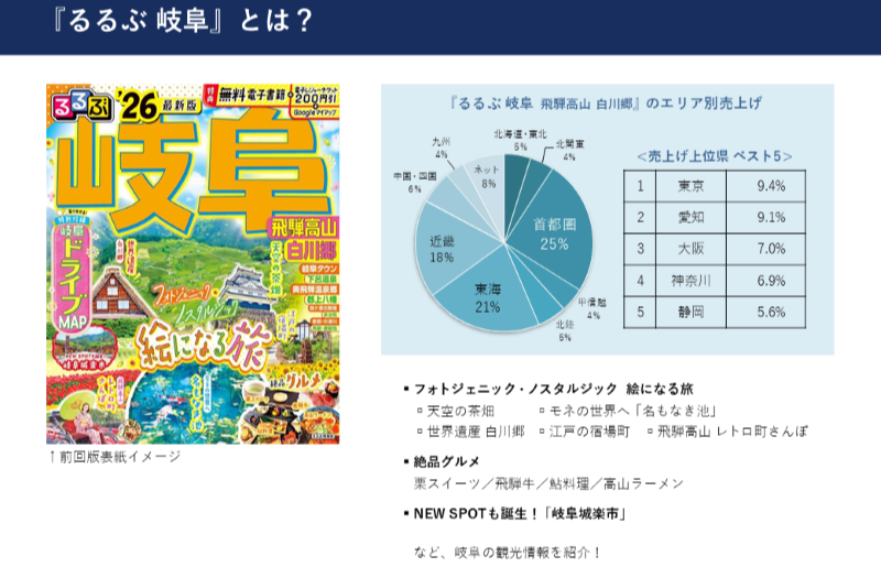 『るるぶ岐阜 飛騨高山 白川郷』の主な特集内容や、地域別売り上げデータを紹介しています。