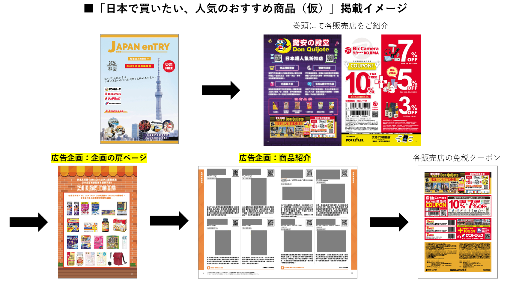 お得な情報が好きな訪日インバウンドに向けて「クーポン・特典」を紹介することで誌面活用の価値を高め、日本到着後の旅程やお買い物リストに加えて頂けるような、魅力な情報を冊子にまとめてお届けします。